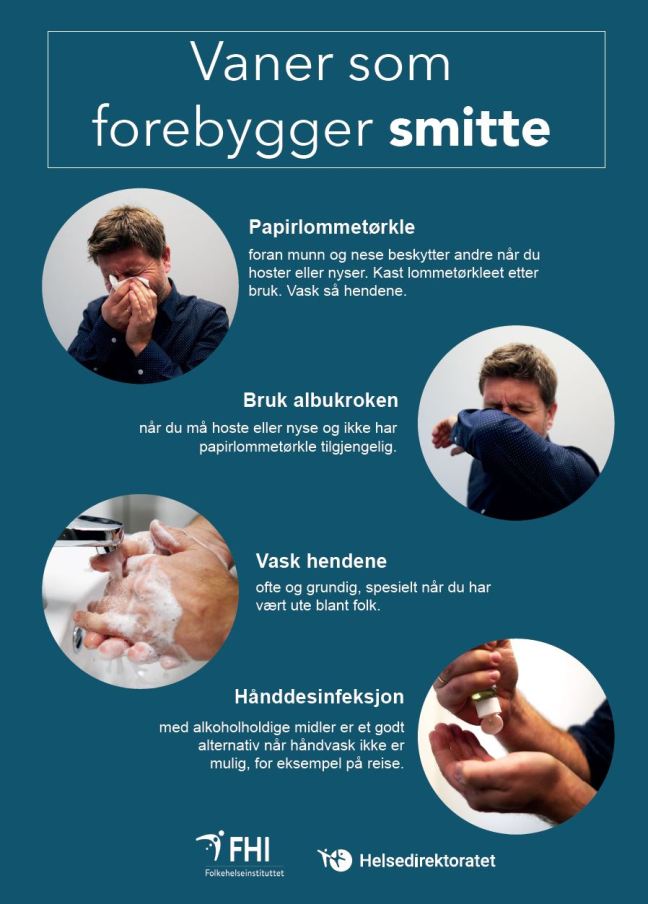 God håndhygiene, både hos syke og friske, er viktig for å hindre smitteoverføring. Vask hendene ofte og grundig med såpe og lunkent vann, spesielt når du har vært ute blant folk. Hånddesinfeksjon er et godt alternativ dersom håndvask ikke er mulig. Dersom hendene er synlig skitne eller våte har hånddesinfeksjon redusert effekt, og hendene bør rengjøres med såpe og vann.